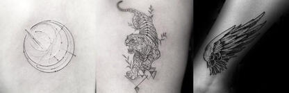 Tattoos: A small pair of wings on his ankles, geometric tiger down the side of his neck, crescent moon on hipbone, "l'appel du vide" down his right inner arm.
